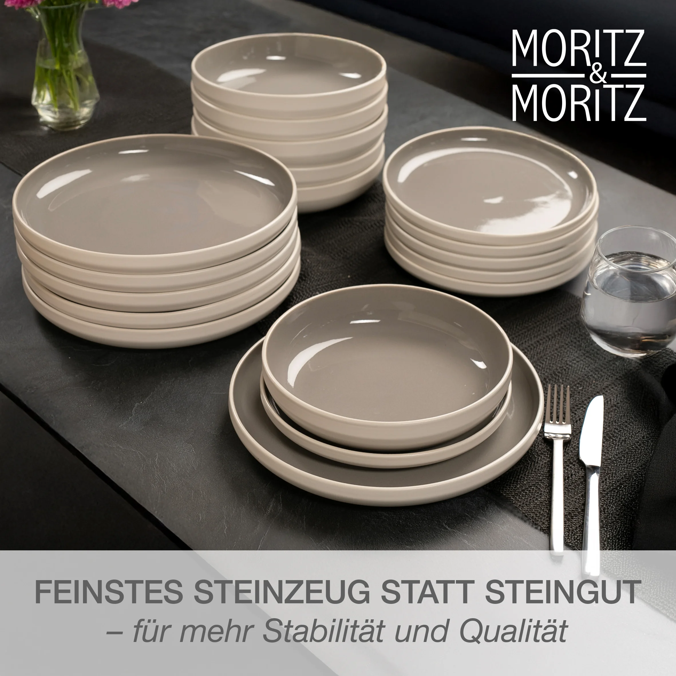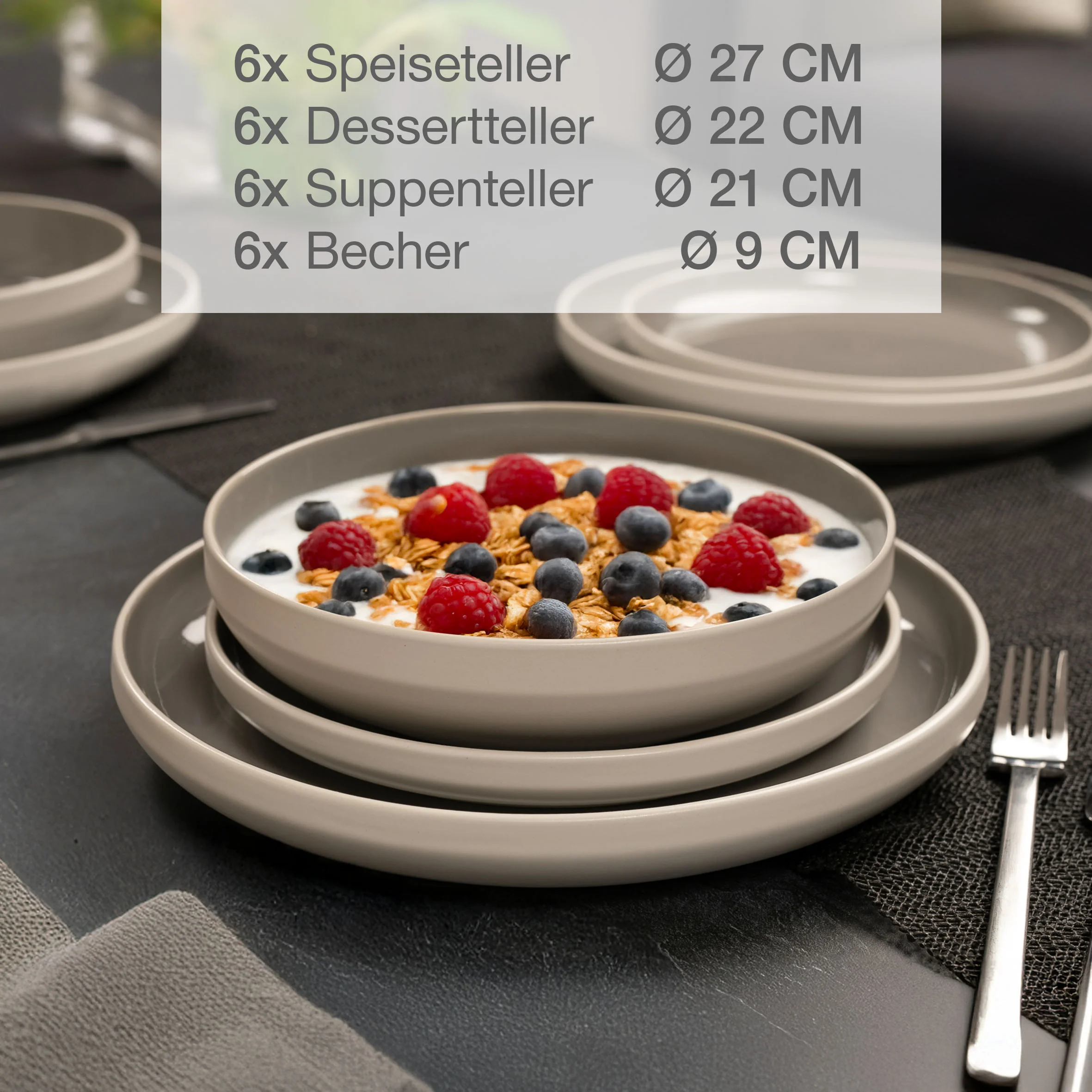 Mit dem CAVO 24-teiligen Geschirrset in Stone von Moritz & Moritz bringst du skandinavischen Charme und robuste Qualität auf deinen Tisch. Das moderne Tafelservice überzeugt mit klaren Linien, einer natürlichen Farbgebung und der einzigartigen Haptik von hochwertigem Steinzeug. Perfekt geeignet für 6 Personen – egal ob im Alltag, beim Brunch mit Freunden oder für festliche Dinner.