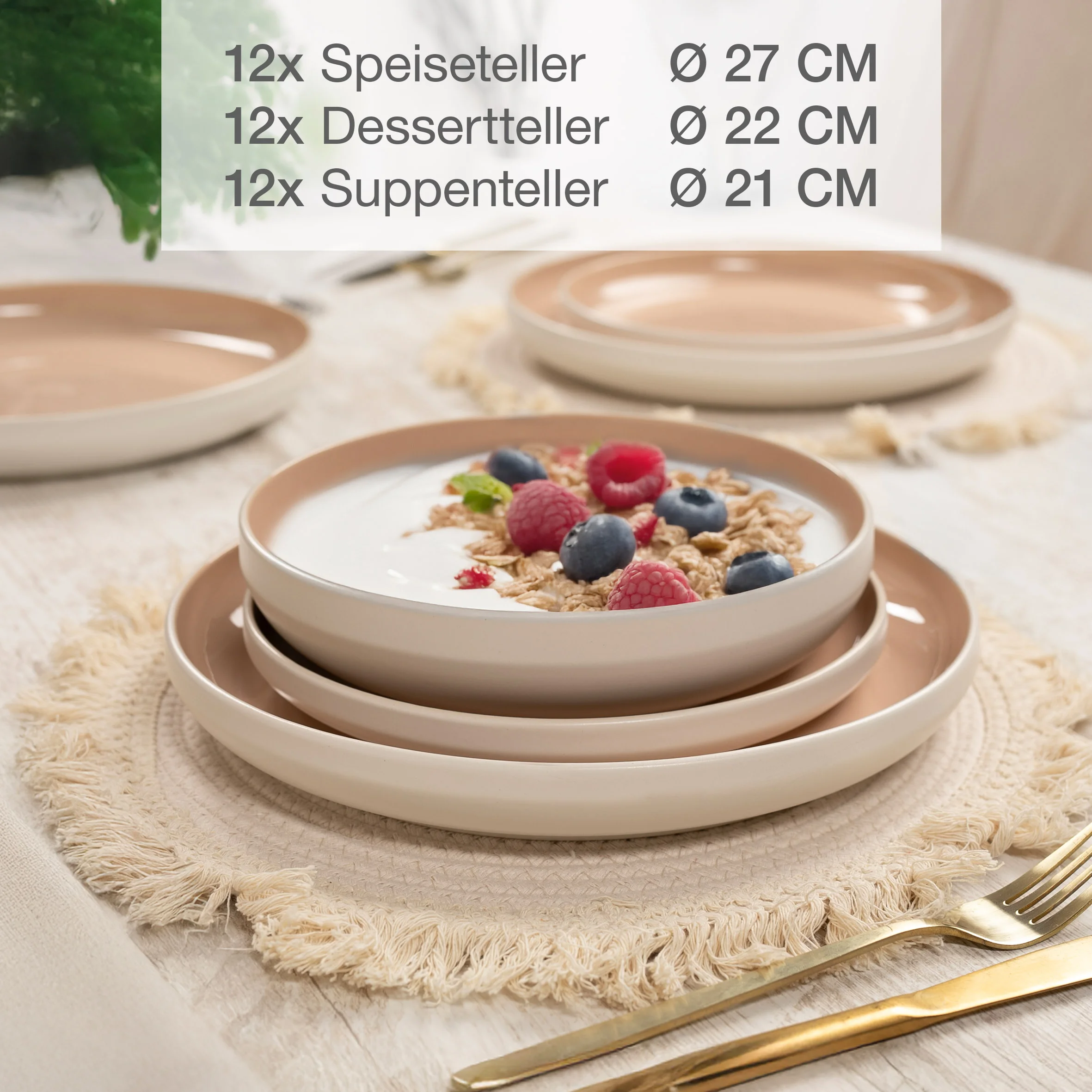 Das Service umfasst 12 Essteller (26 cm Ø), 12 Suppenschüsseln (19 cm Ø) und 12 Dessertteller (21 cm Ø). Damit bist du ideal ausgestattet, um bis zu 12 Personen bei Dinnerpartys, Familienessen oder Brunch stilvoll zu bewirten. Durch die reaktive Glasur ist jedes Teil ein Unikat, das deinem Tisch eine individuelle Note verleiht.