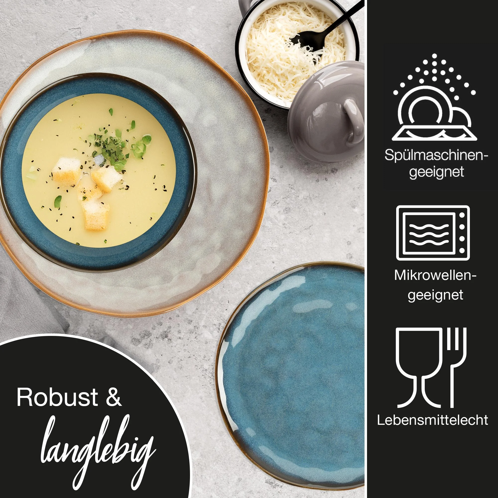 Das Geschirr besteht aus robustem Steinzeug, das Funktionalität und Ästhetik perfekt vereint. Es ist sowohl spülmaschinen- als auch mikrowellengeeignet und damit ideal für den täglichen Gebrauch. Dank der hochwertigen Verarbeitung ist das Set langlebig und bringt gleichzeitig Eleganz auf deinen Tisch.