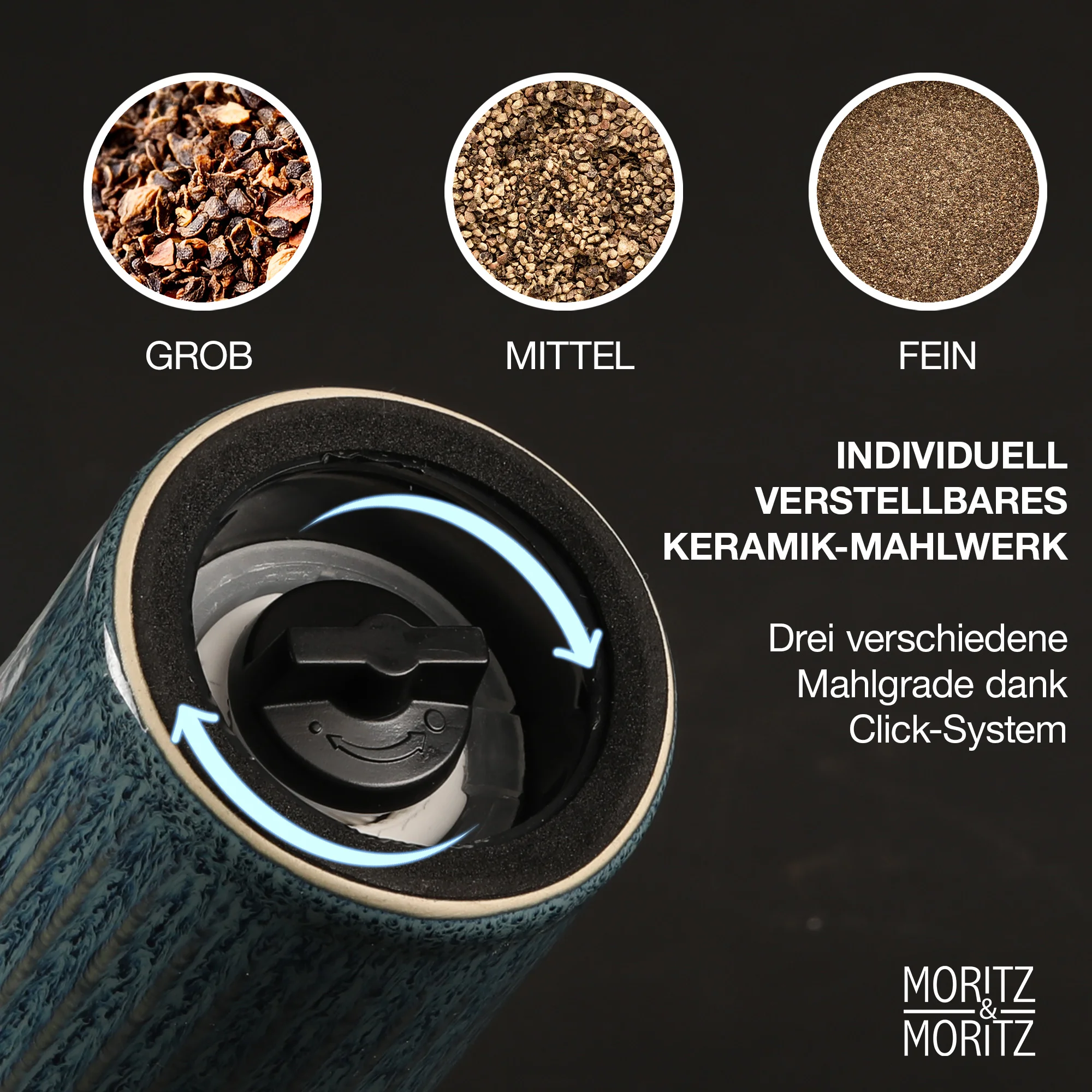 Das Herzstück des PEPE Gewürzmühlen Sets ist das leistungsstarke Keramikmahlwerk, das nicht nur langlebig und rostfrei ist, sondern auch geschmacksneutral arbeitet. So bleiben die Aromen deiner Gewürze vollkommen unverfälscht – ideal für fein abgestimmte Gerichte. Mit dem praktischen Click-System lässt sich der Mahlgrad individuell einstellen: Ob fein gemahlenes Salz für Salate oder grober Pfeffer für ein saftiges Steak – du hast die volle Kontrolle über die Körnung. Auch Chili, Kräuter oder exotische Gewürzmischungen lassen sich zuverlässig und gleichmäßig mahlen.