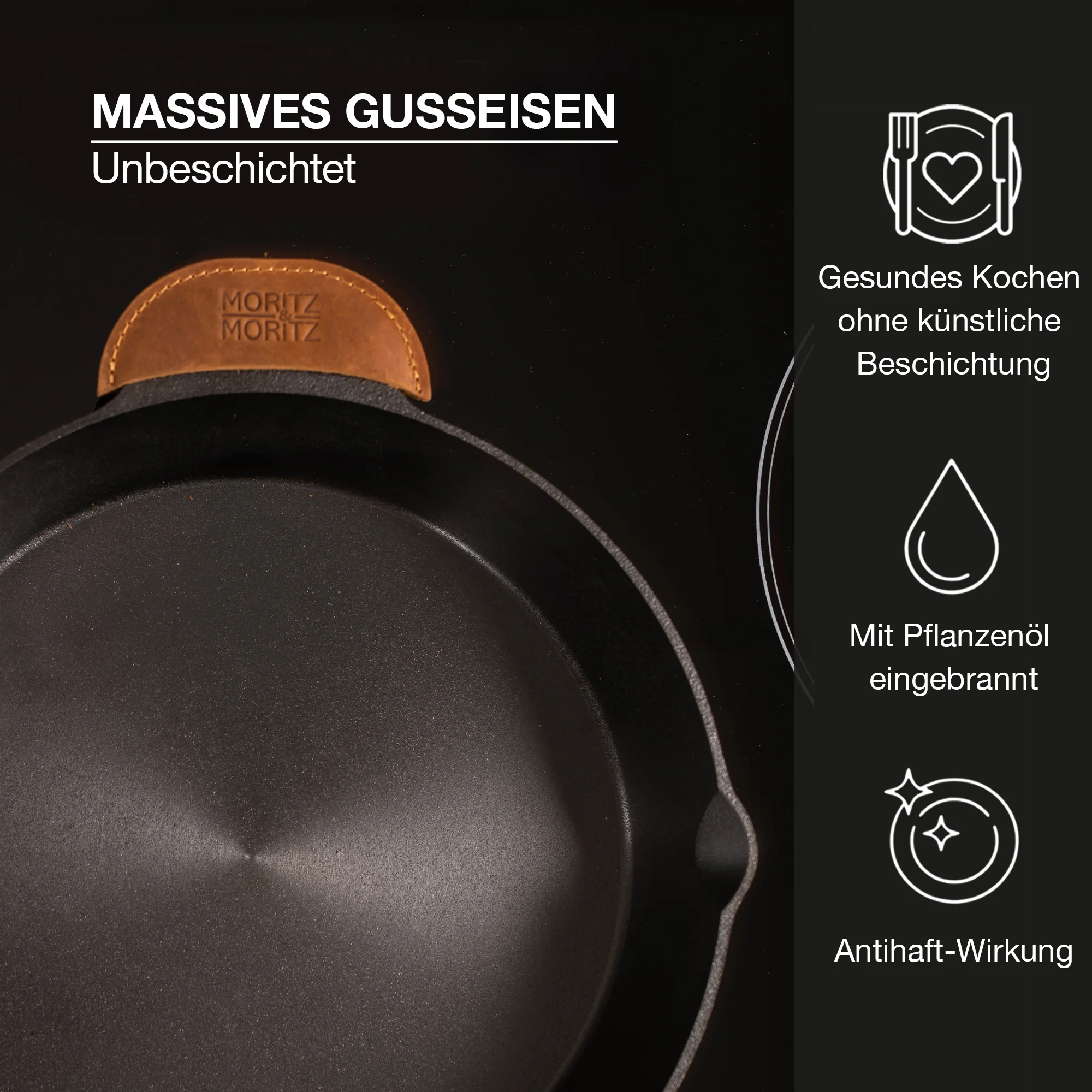 Für zusätzlichen Komfort sorgen praktische Extras: Der abnehmbare Griffschutz aus hochwertigem Leder schützt zuverlässig vor Hitze, während der beiliegende Pfannenwender mit Holzgriff das Wenden und Servieren erleichtert – sanft zur Oberfläche und angenehm in der Handhabung. Die Gusseisenpfanne punktet nicht nur mit Funktionalität, sondern auch mit Nachhaltigkeit. Sie begleitet dich über viele Jahre hinweg und wird mit der Zeit immer besser.