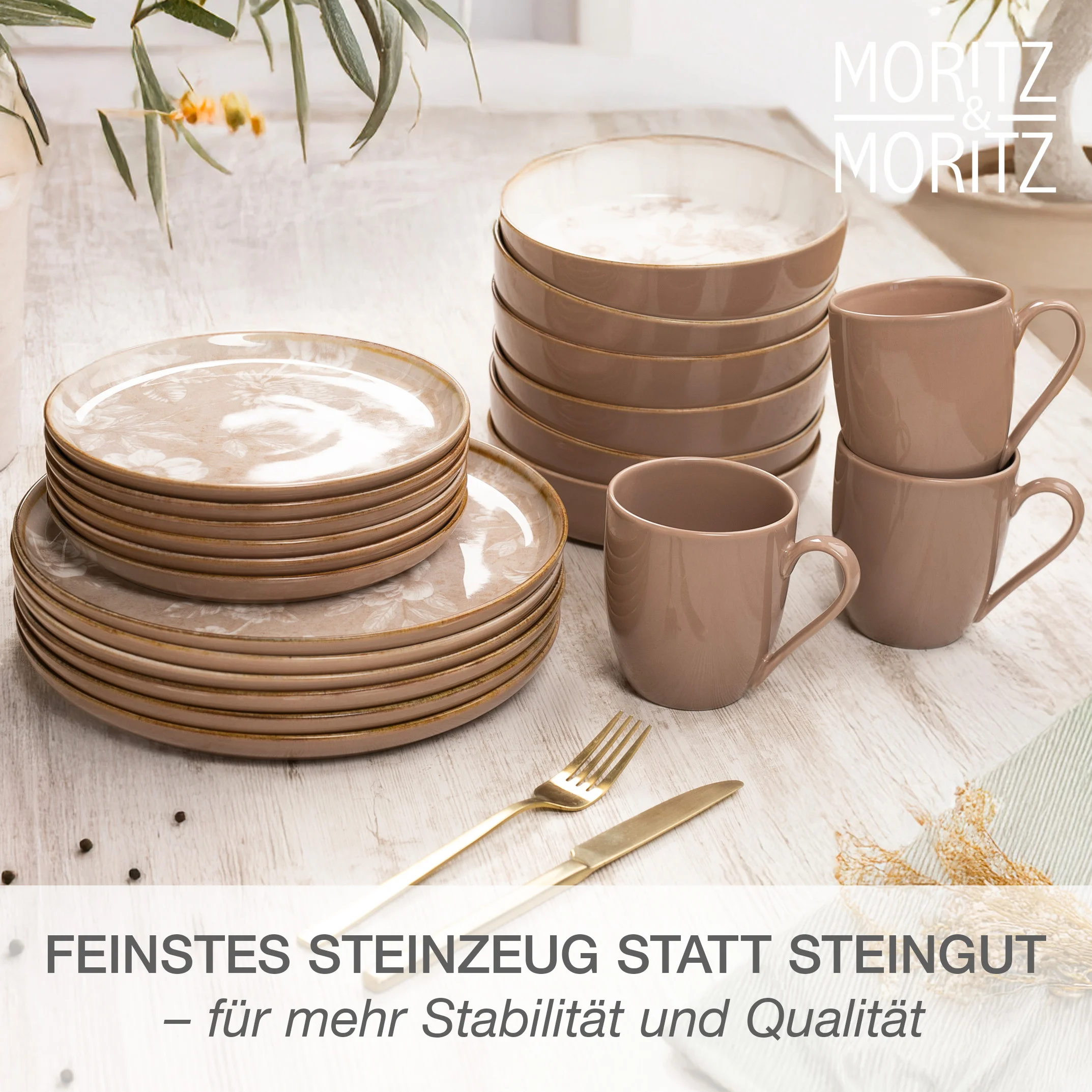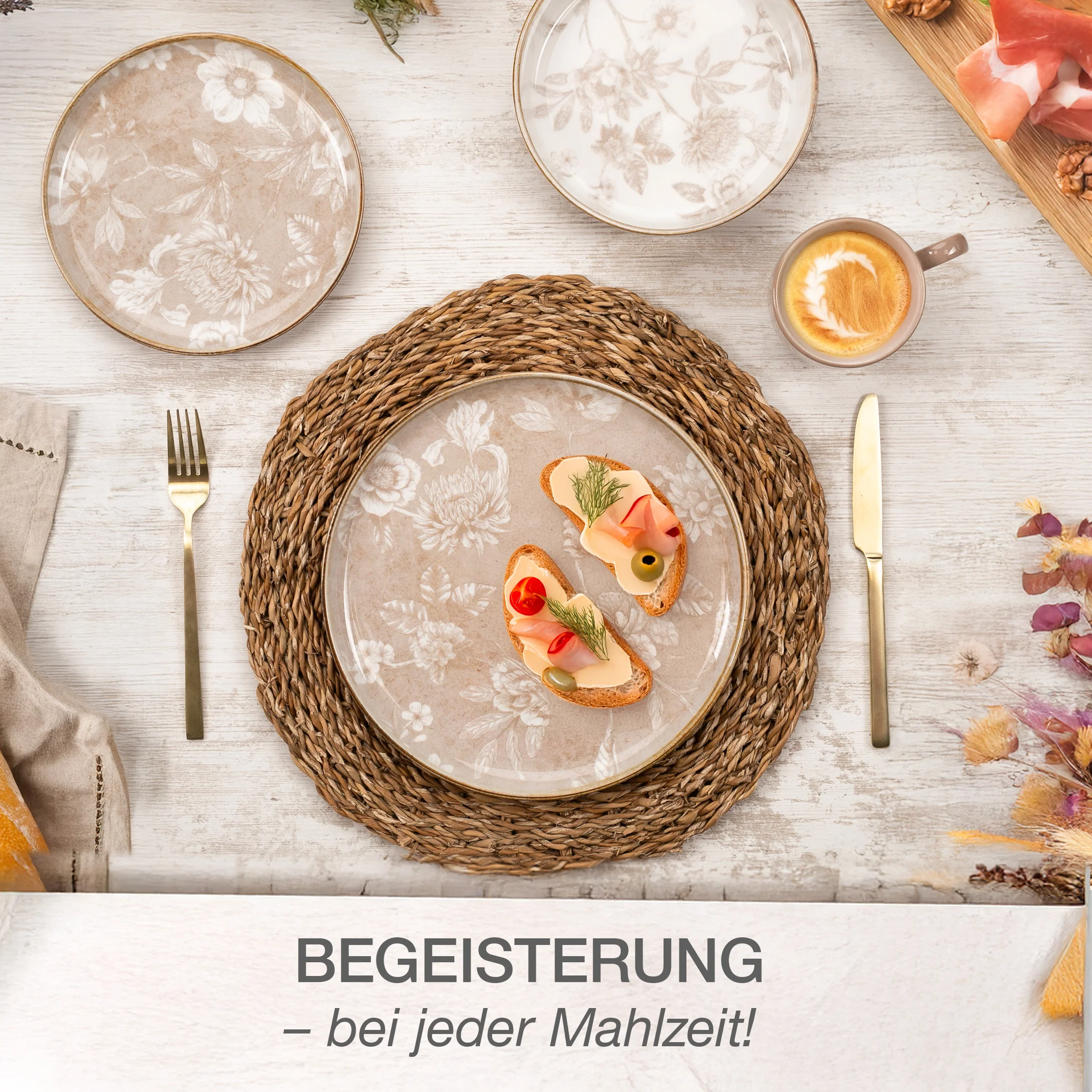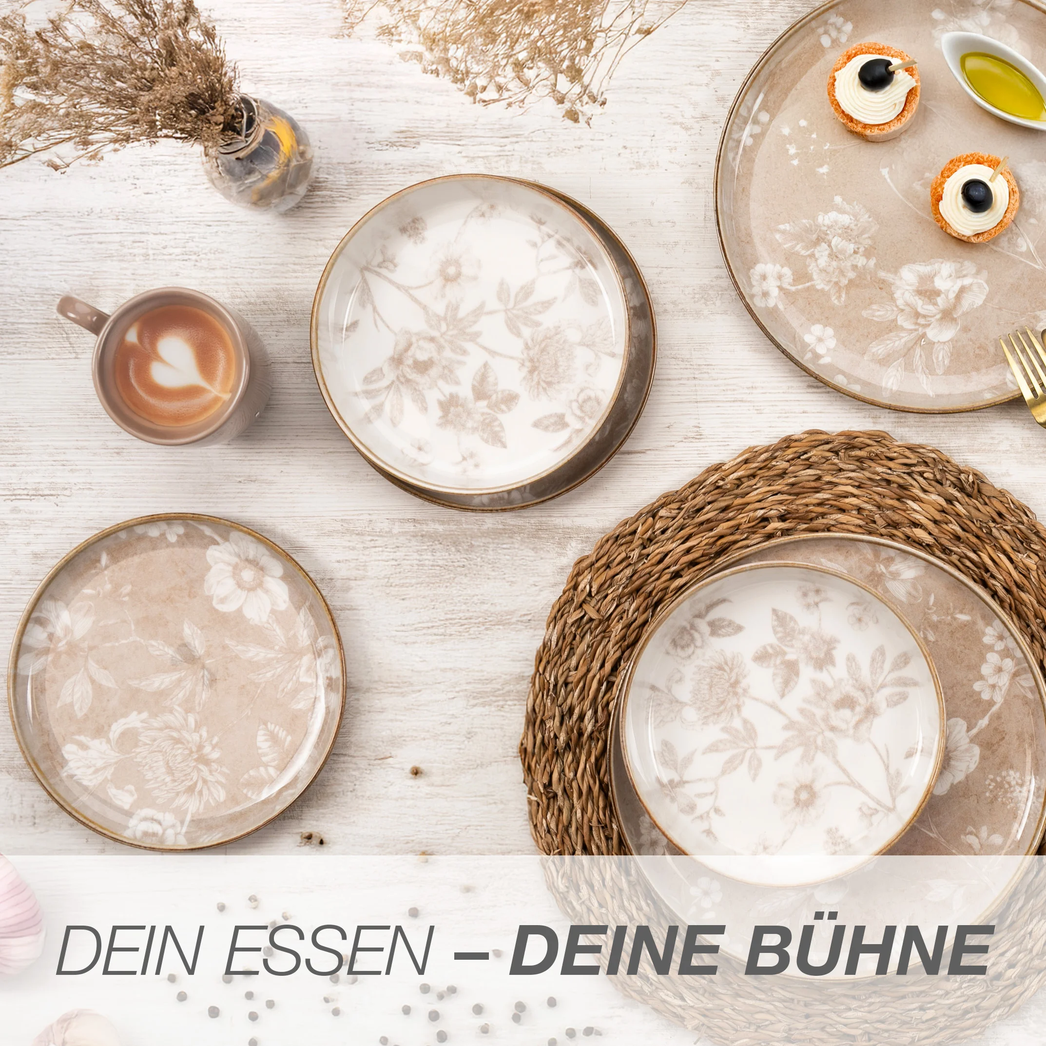 Das sanfte Beige mit floralem Muster sorgt für eine natürliche, warme Atmosphäre und passt perfekt zu Holz, Glas oder hellen Stoffen. Ein Geschirrset, das zeitlos, charmant und absolut alltagstauglich ist.