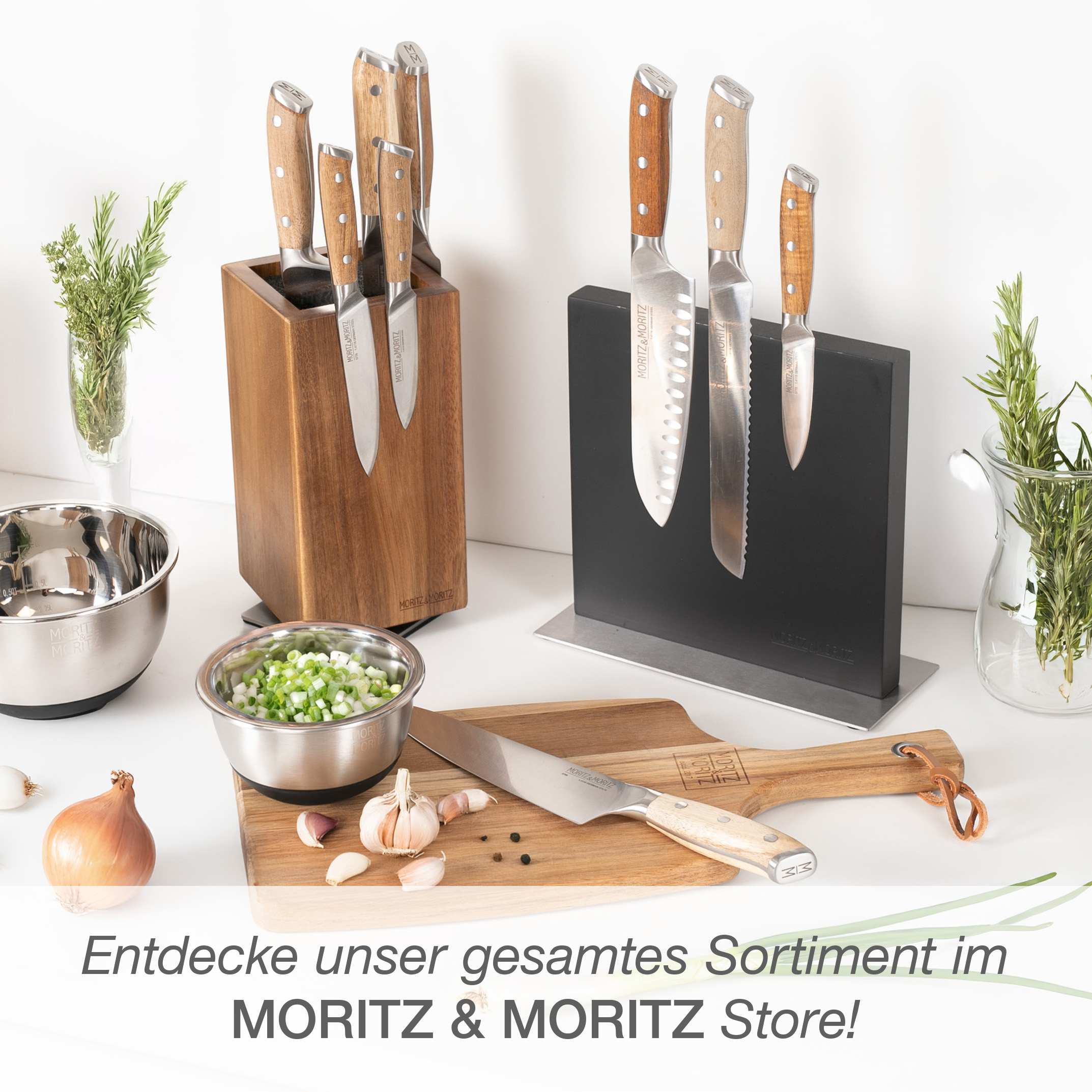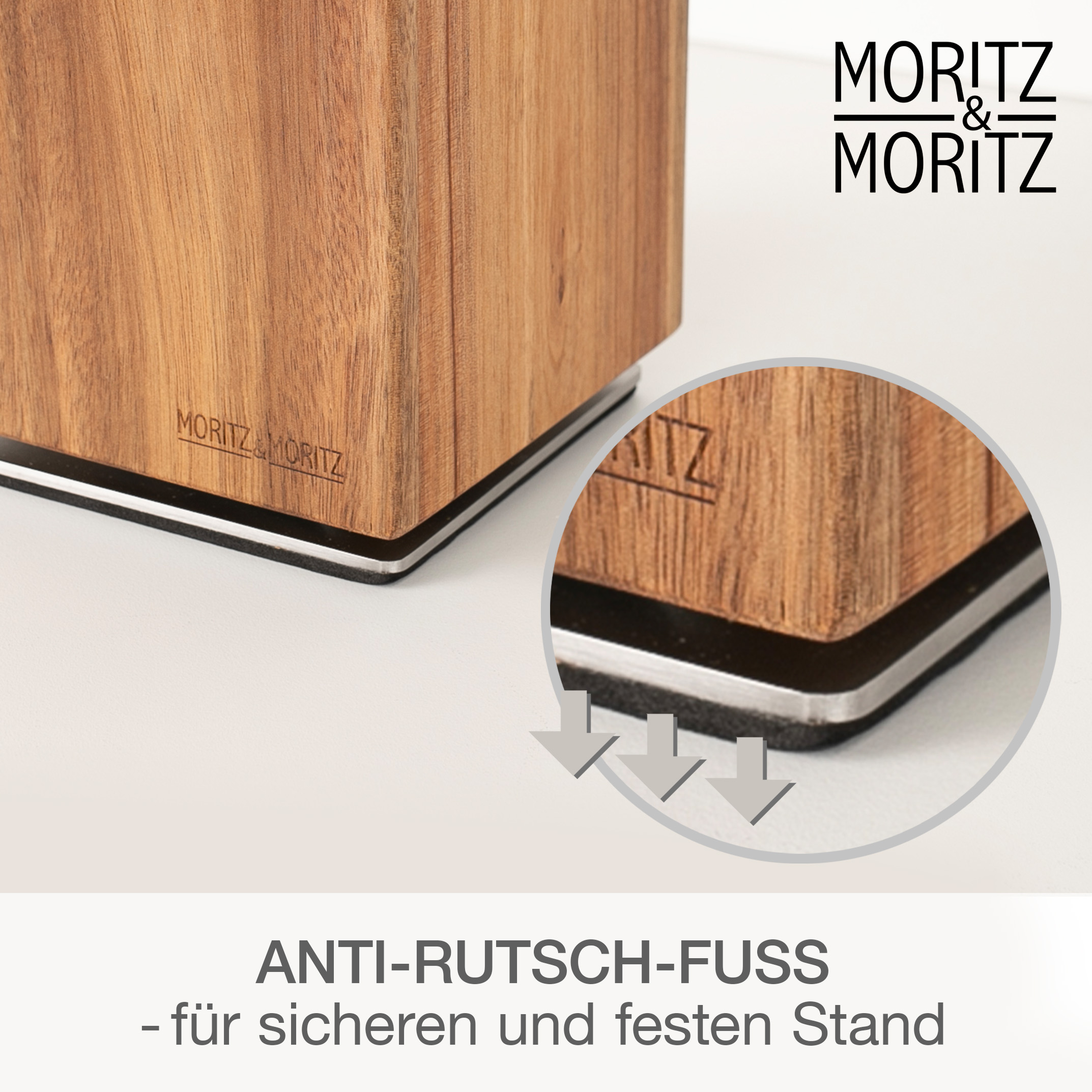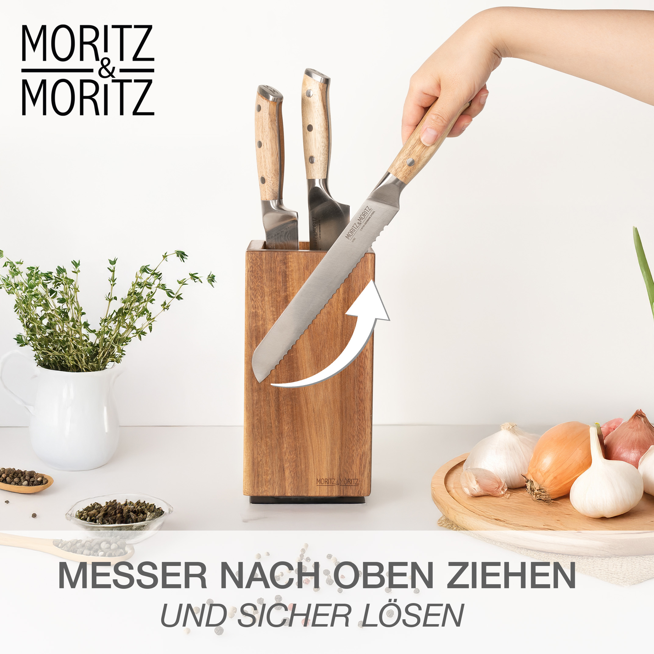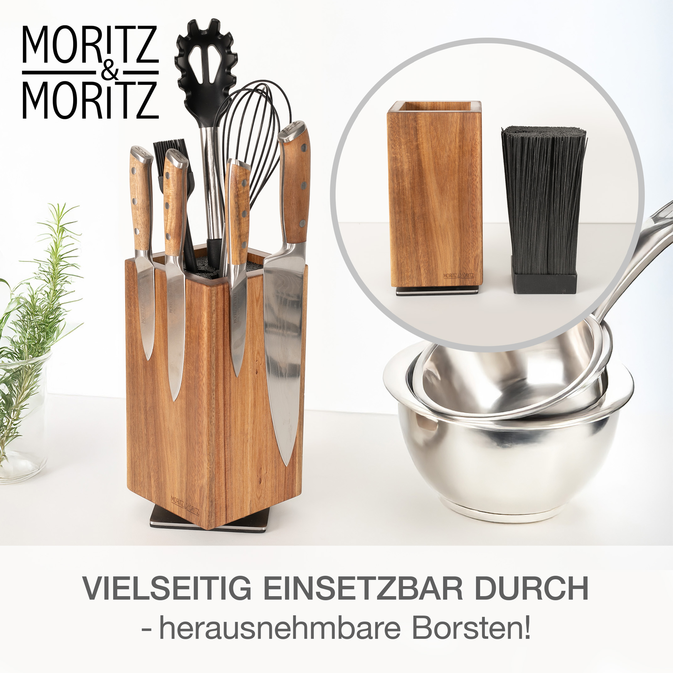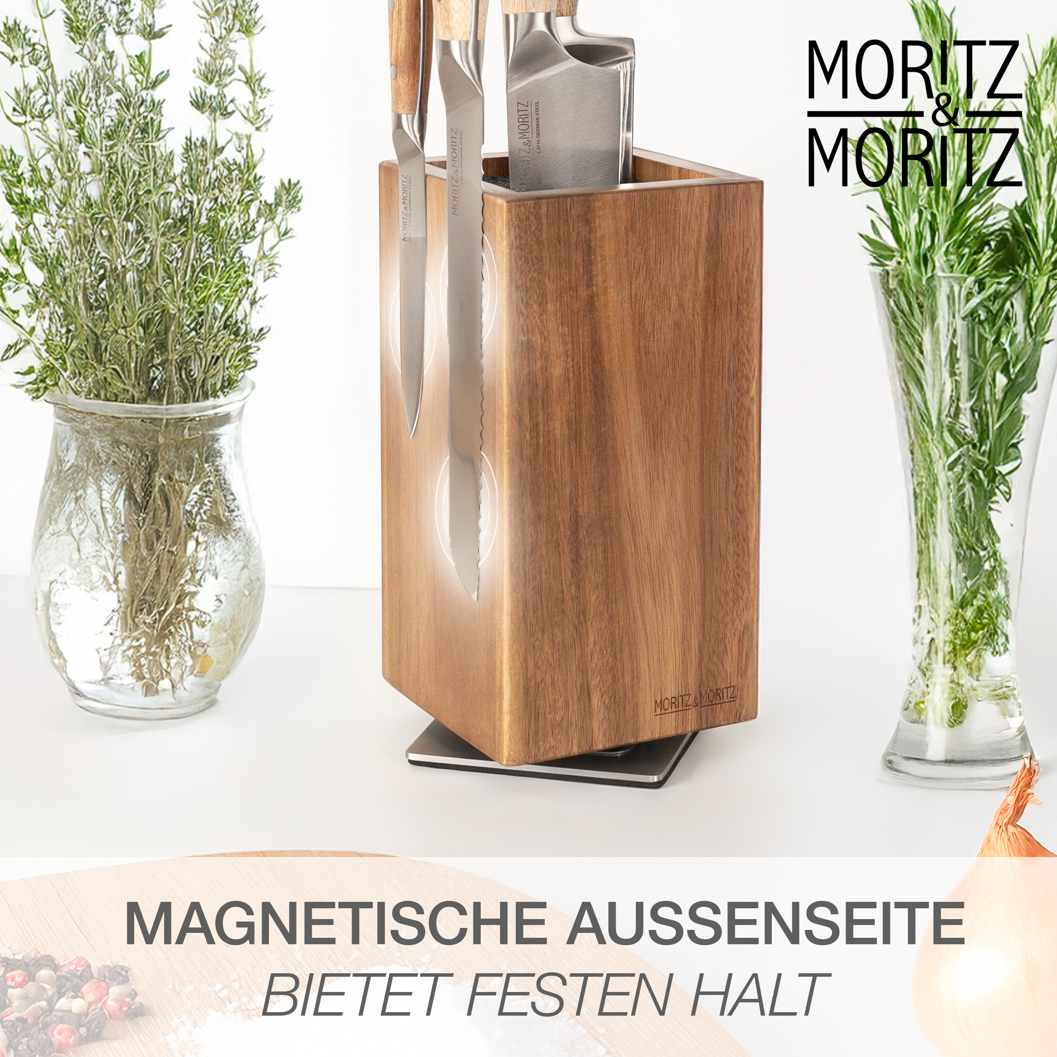 Der Moritz & Moritz Messerblock aus Akazienholz vereint Design, Funktionalität und Flexibilität auf höchstem Niveau. Dank seines 360° drehbaren Standfußes hast du alle Messer jederzeit griffbereit – ganz gleich, wo du in der Küche stehst. Der edle Holzblock ist nicht nur ein praktisches Aufbewahrungssystem, sondern auch ein stilvolles Statement-Piece für jede moderne Küche.