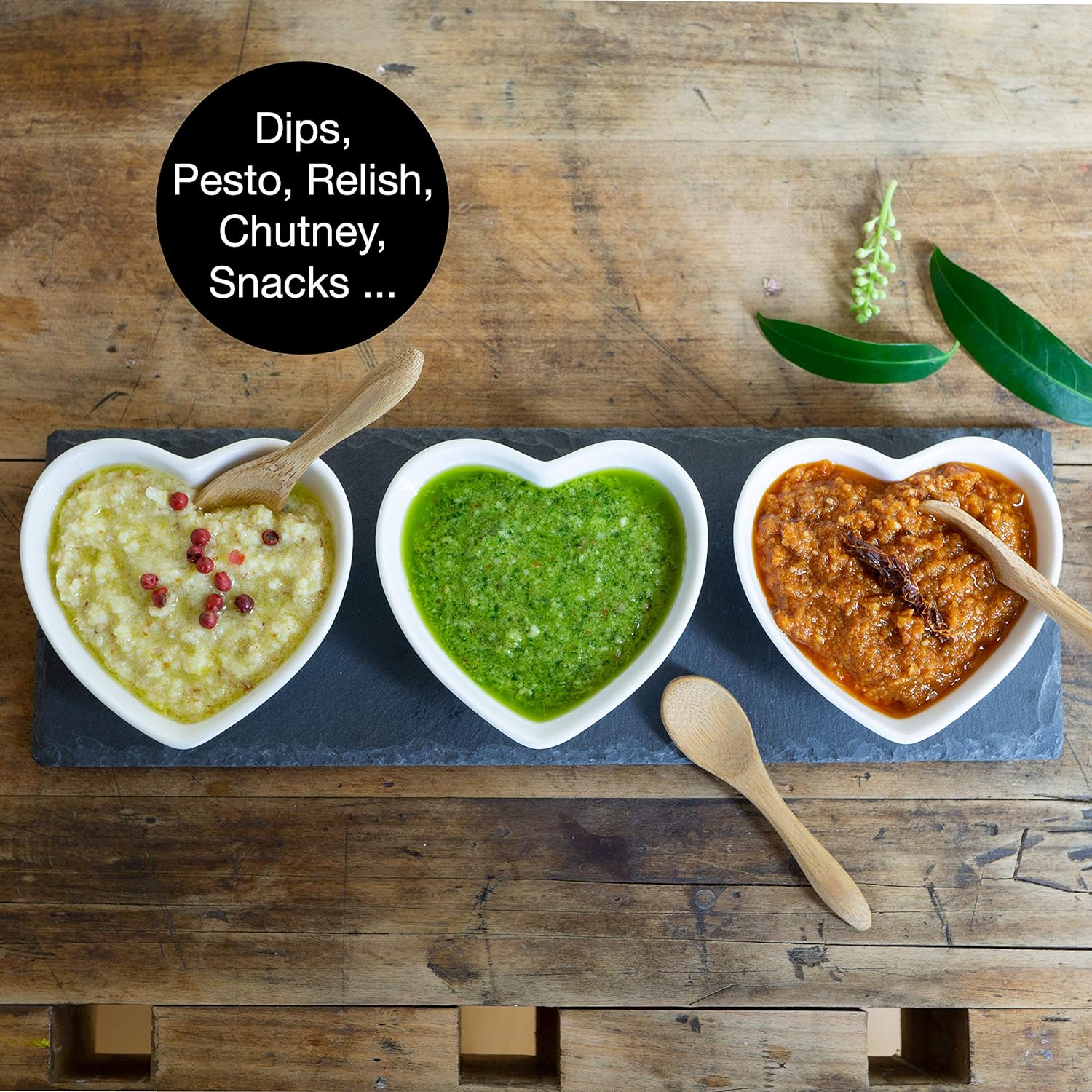 Ob süß oder salzig, herzhaft oder fruchtig – deiner Kreativität sind keine Grenzen gesetzt. Die Schälchen sind spülmaschinenfest und mikrowellengeeignet, während Bambuslöffel und Schieferplatte mit warmem Wasser einfach per Hand gereinigt werden können. So hast du lange Freude an deinem neuen Lieblingsstück.