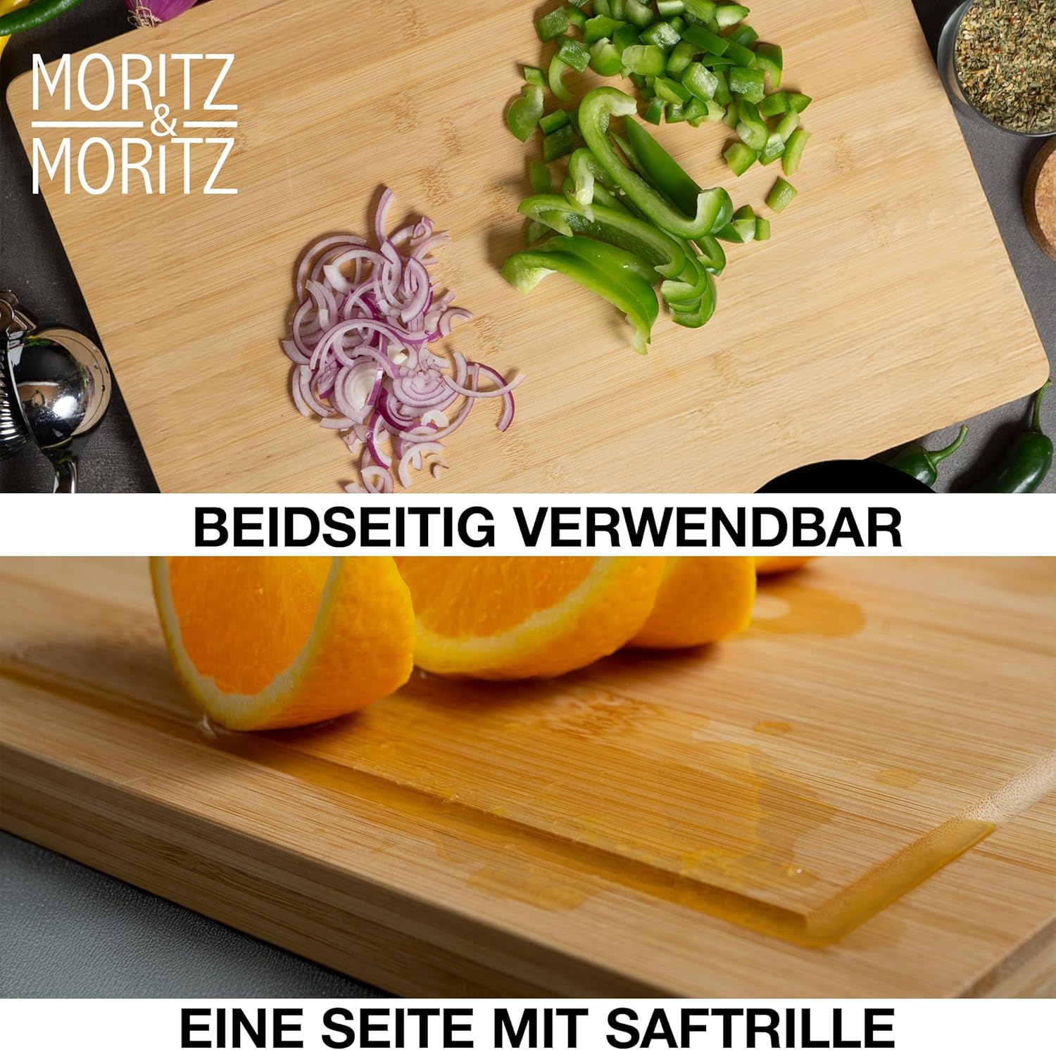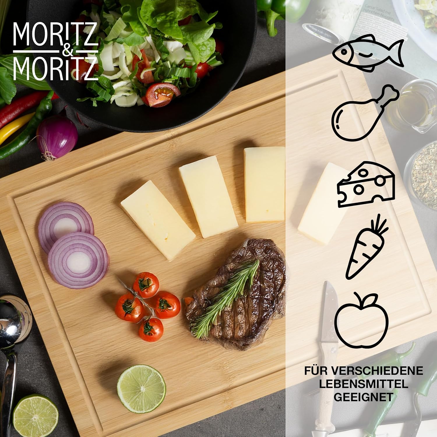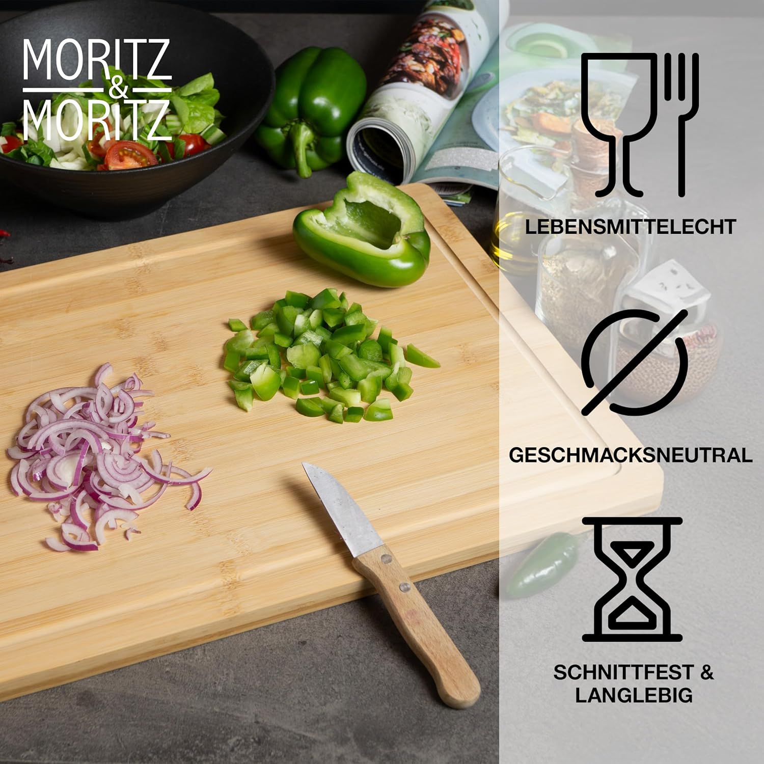 Mit dem Moritz & Moritz Bambus-Schneidebrett holst du dir ein hochwertiges Küchenaccessoire, das Eleganz und Funktionalität perfekt kombiniert. Ob als Schneidbrett, Servierplatte oder dekoratives Highlight – dieses Brett ist vielseitig, robust und ein Must-have für deine Küche!