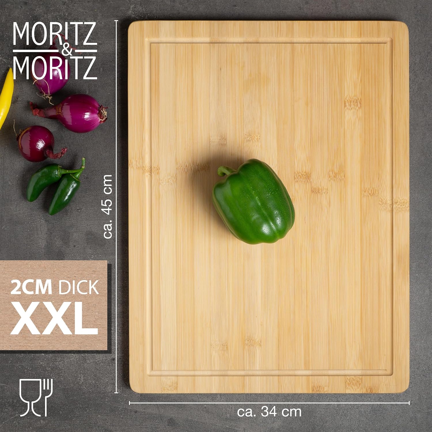 Entdecke das hochwertige Moritz & Moritz Schneidebrett aus massivem Bambus – dein zuverlässiger Partner für die tägliche Küchenarbeit. Mit großzügigen Maßen von 45 x 34 x 2 cm bietet dieses Küchenbrett viel Platz zum Schneiden, Anrichten und Servieren. Die praktische Saftrille fängt Flüssigkeiten zuverlässig auf und sorgt für eine saubere Arbeitsfläche.