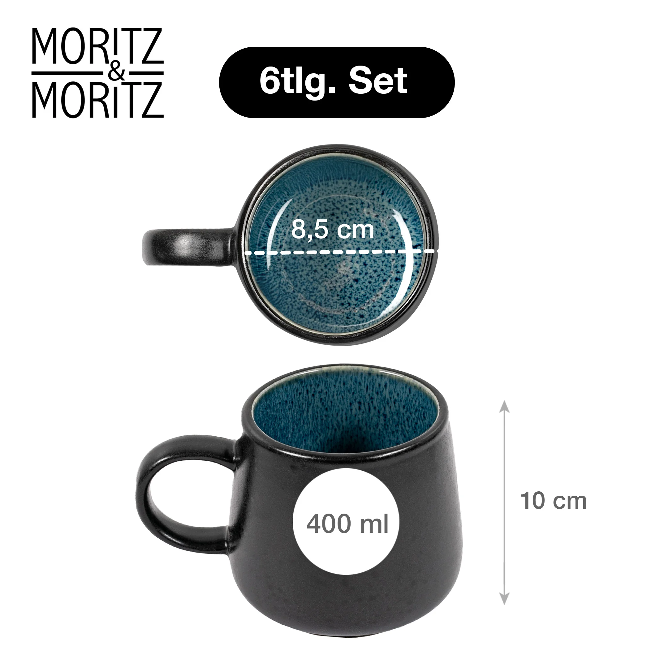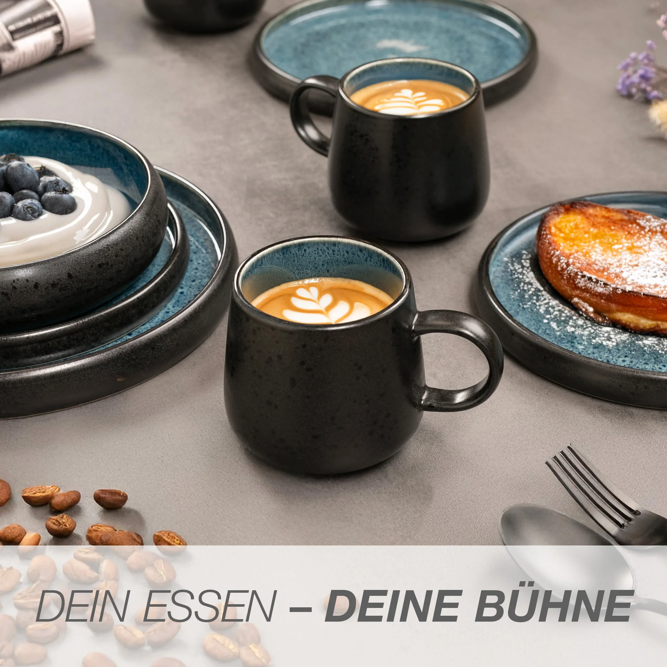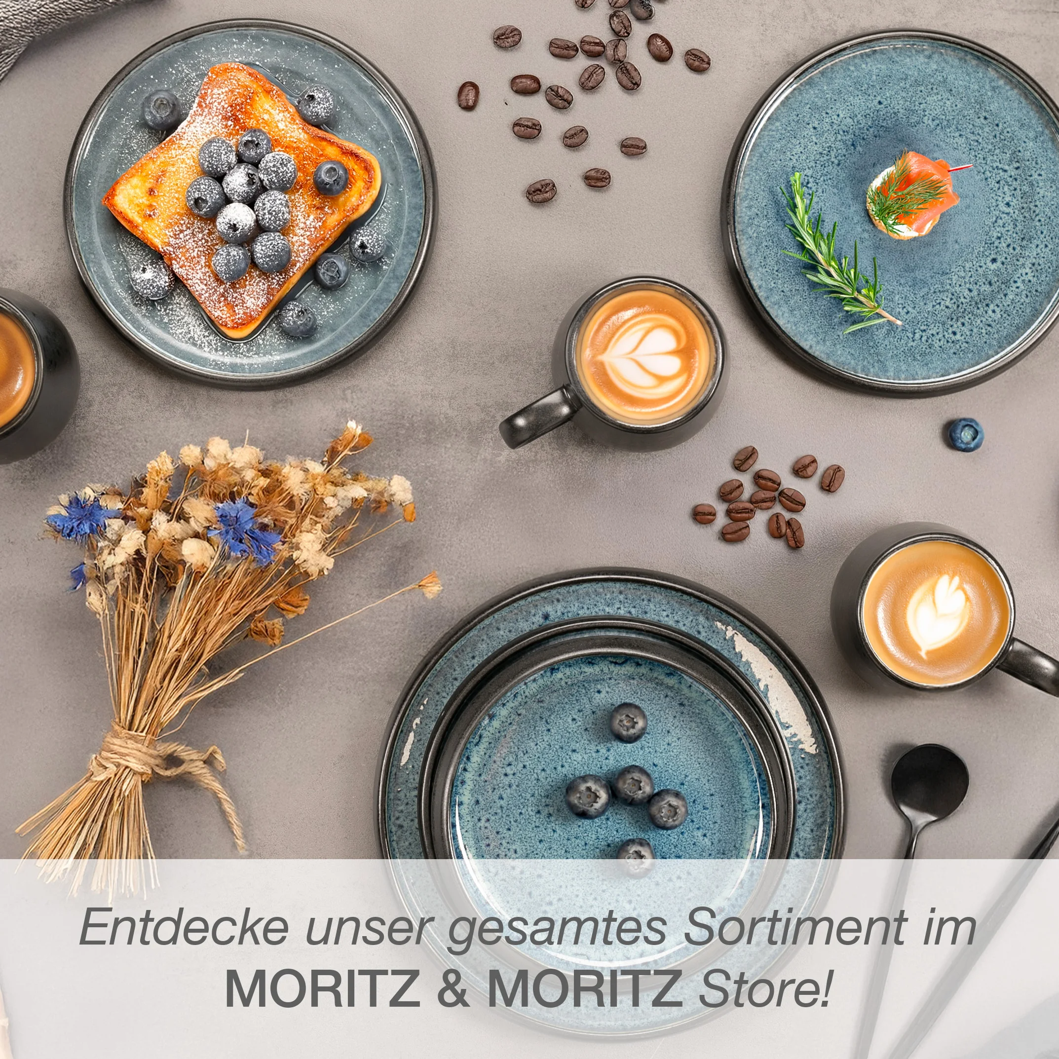Das 24-teilige Geschirrset von Moritz & Moritz in Blau und Mattschwarz vereint stilvolles Design mit höchster Funktionalität. Es enthält alles für ein perfekt gedecktes Tischbild: 6 große Speiseteller (26 cm Ø), 6 Dessertteller (21 cm Ø), 6 tiefe Suppenteller (19 cm Ø) und 6 großzügige Tassen (380 ml). Mit seiner eleganten, reaktiven Glasur ist jedes Teil ein Unikat und macht jede Mahlzeit zu einem besonderen Erlebnis.
