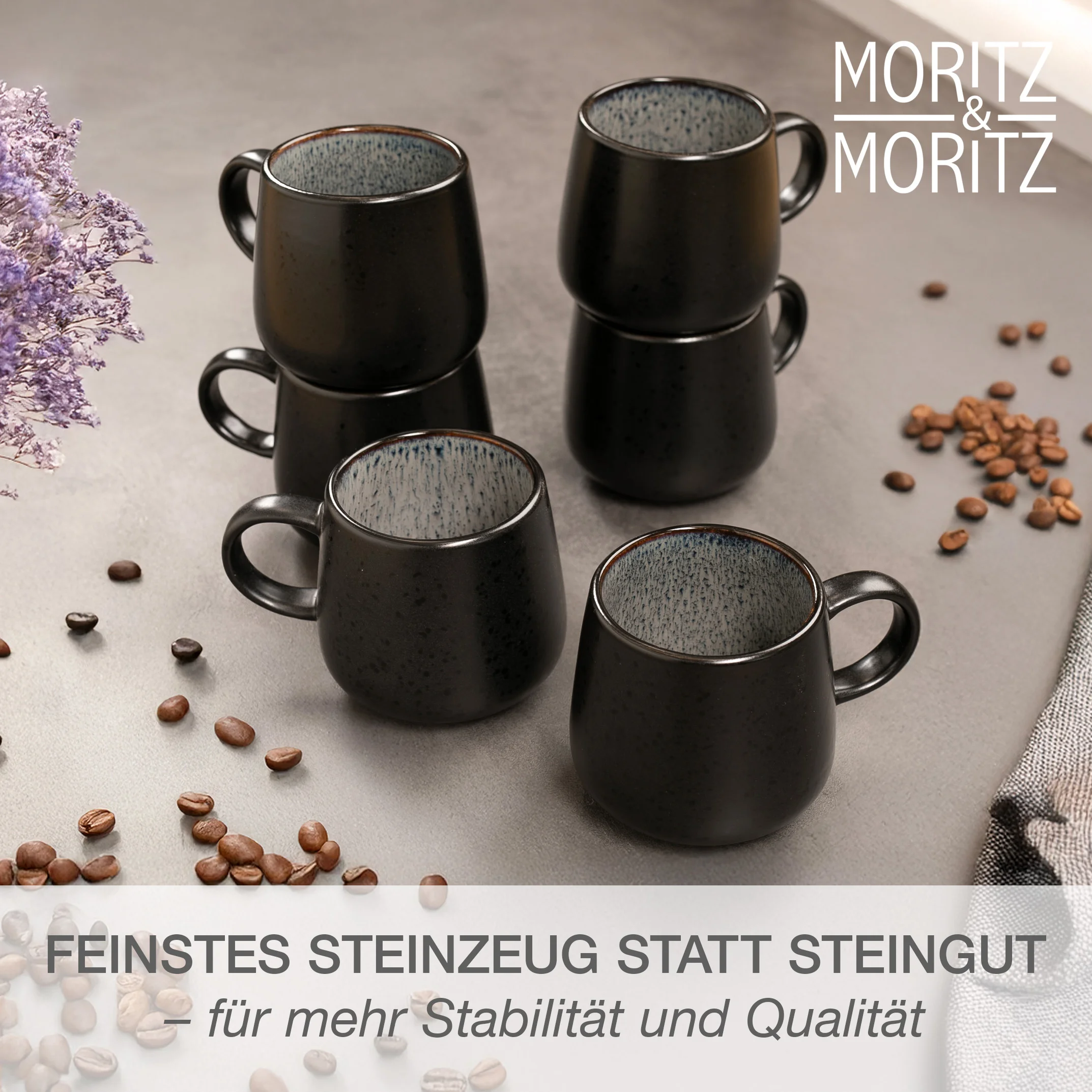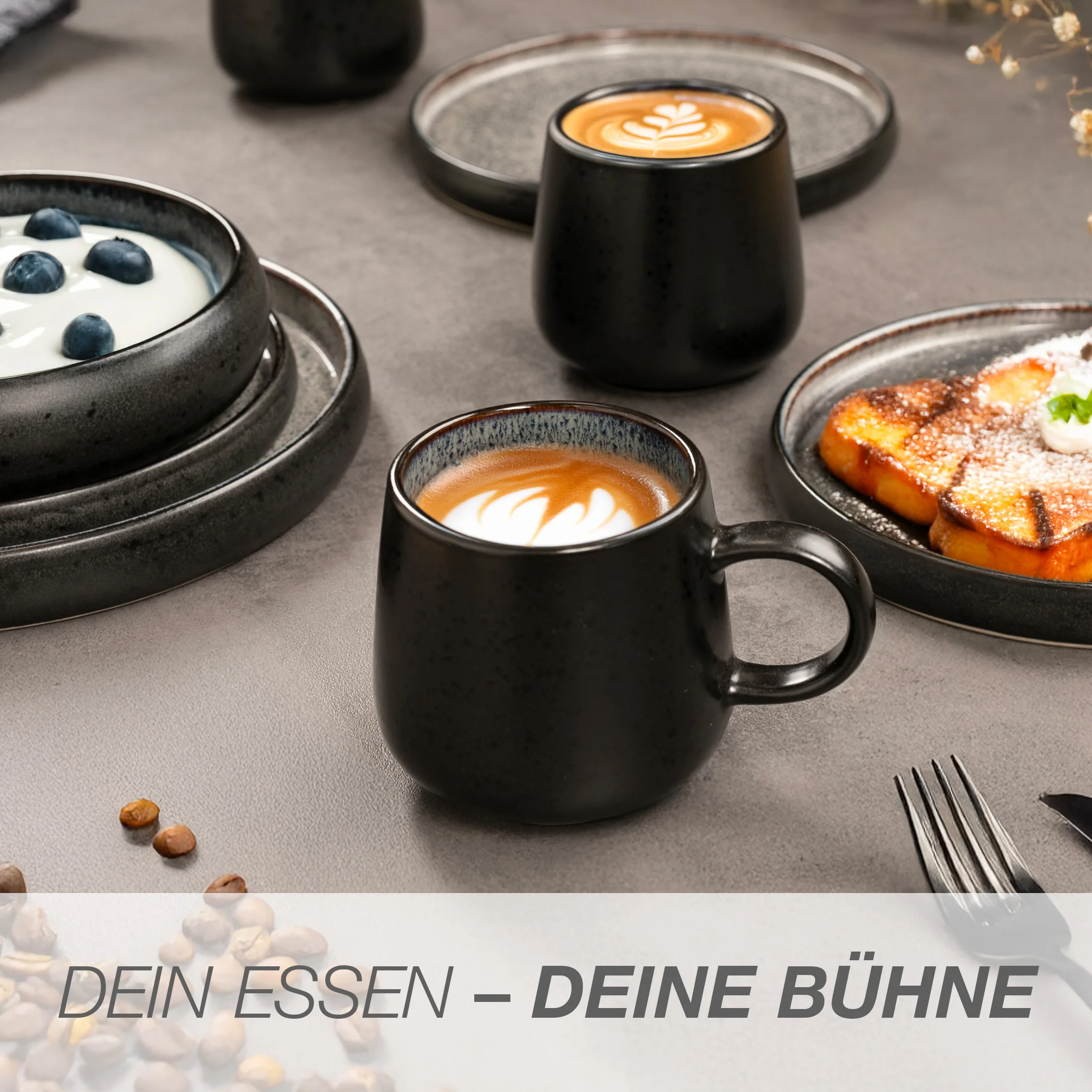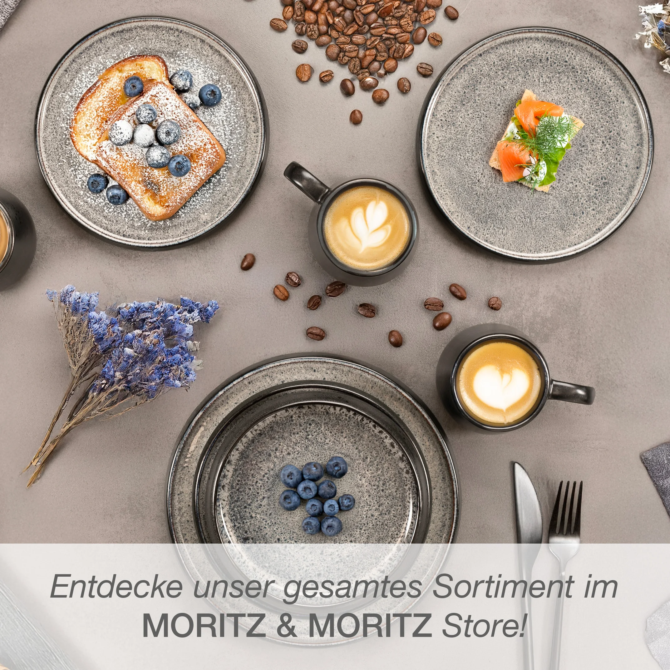 Das 24-teilige Geschirrset von Moritz & Moritz vereint modernes Design, hochwertige Materialien und vielseitige Einsatzmöglichkeiten. Mit je 6 Speisetellern (26 cm Ø), Desserttellern (21 cm Ø), Suppentellern (19 cm Ø) und großzügigen Tassen (380 ml) ist dieses Set perfekt für den Alltag und festliche Anlässe. Die elegante Farbkombination aus Grau und Mattschwarz, kombiniert mit der reaktiven Glasur, macht jedes Teil zu einem echten Unikat.