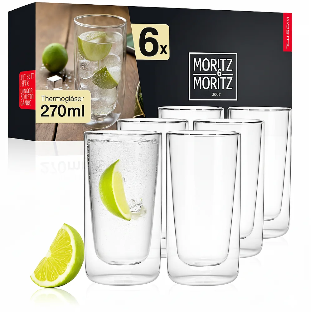 Mit den doppelwandigen Thermogläsern (6er Set) genießt du Heiß- und Kaltgetränke immer in perfekter Temperatur. Die eleganten Gläser aus hochwertigem, hitzebeständigem Borosilikatglas bieten ein Fassungsvermögen von 270 mlund vereinen modernes Design mit funktionaler Isolierleistung – ideal für Kaffee, Tee, Latte Macchiato, Softdrinks oder Cocktails.