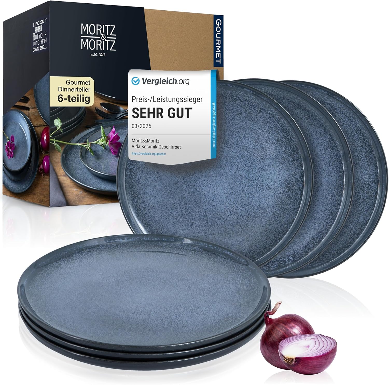 Mit dem Moritz & Moritz Dinner Teller Set 6-teilig holst du dir modernes Design und hochwertige Qualität direkt auf deinen Esstisch. Die eleganten Dinnerteller in einem zeitlosen Blau sind nicht nur ein echter Hingucker, sondern überzeugen auch durch Funktionalität im Alltag.