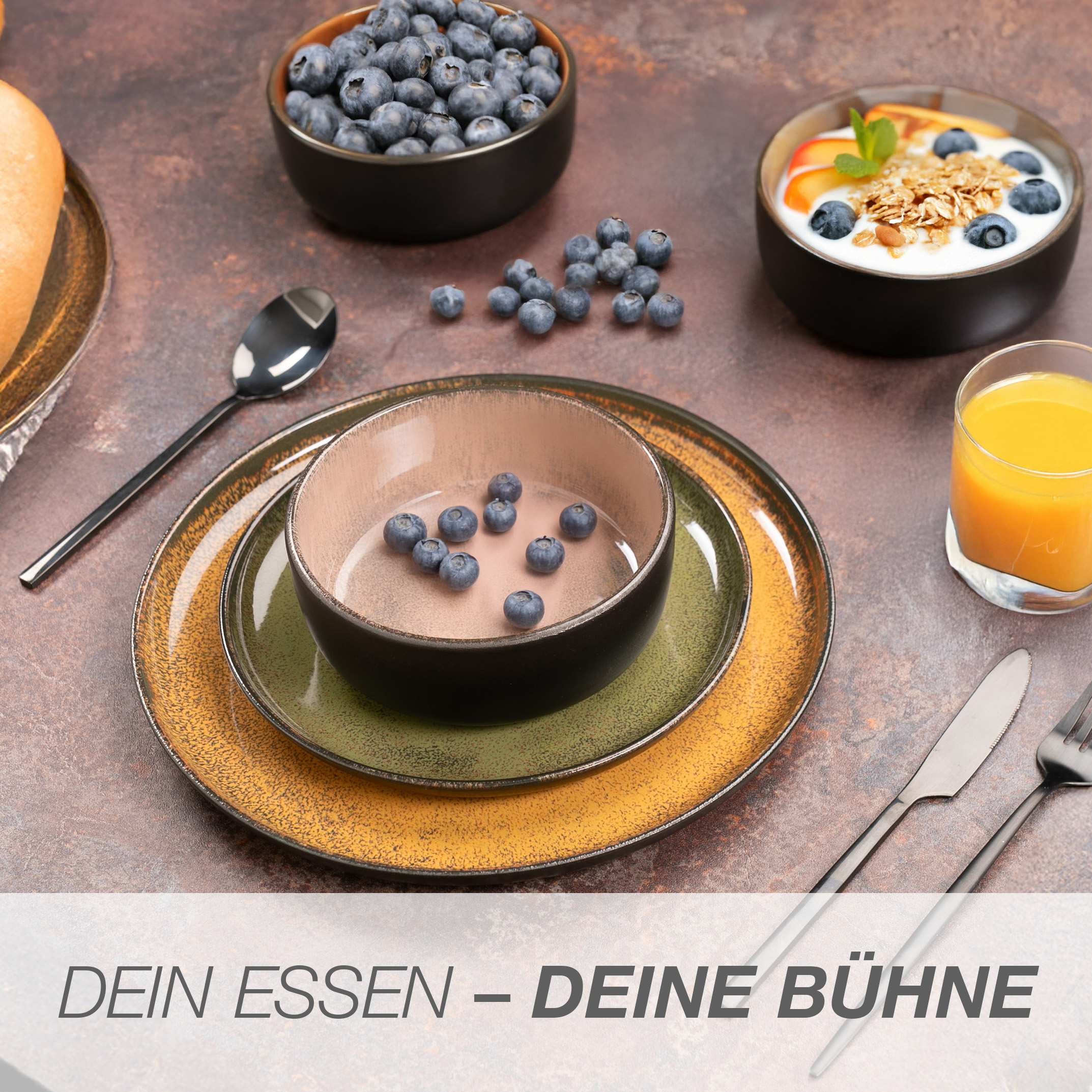 Warme Farbtöne, sanfte Glasurverläufe und eine moderne Vintage-Optik machen dieses Geschirrset zu einem stilvollen Blickfang auf jedem Tisch. Die dezente Struktur sorgt für eine natürliche, wohnliche Atmosphäre, bei der jedes Teil individuell wirkt und sich dennoch harmonisch in das Gesamtbild einfügt. Das Set eignet sich ideal für den täglichen Gebrauch ebenso wie für besondere Anlässe.