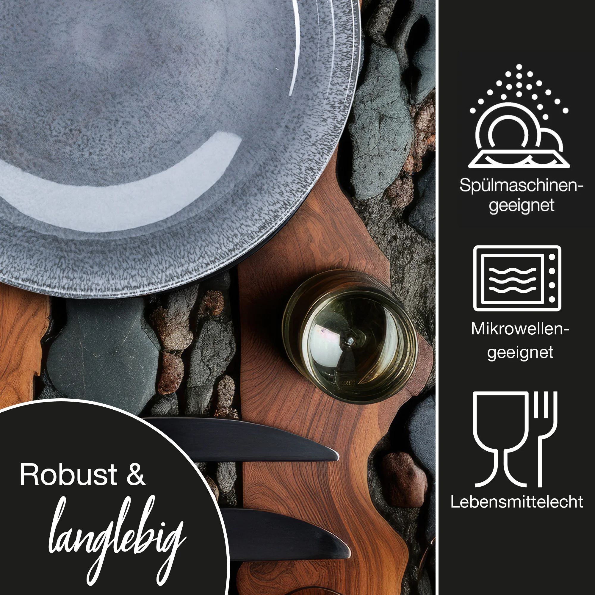 - Eigenschaften: Kratzfest, langlebig, pflegeleicht, mikrowellengeeignet, spülmaschinengeeignet