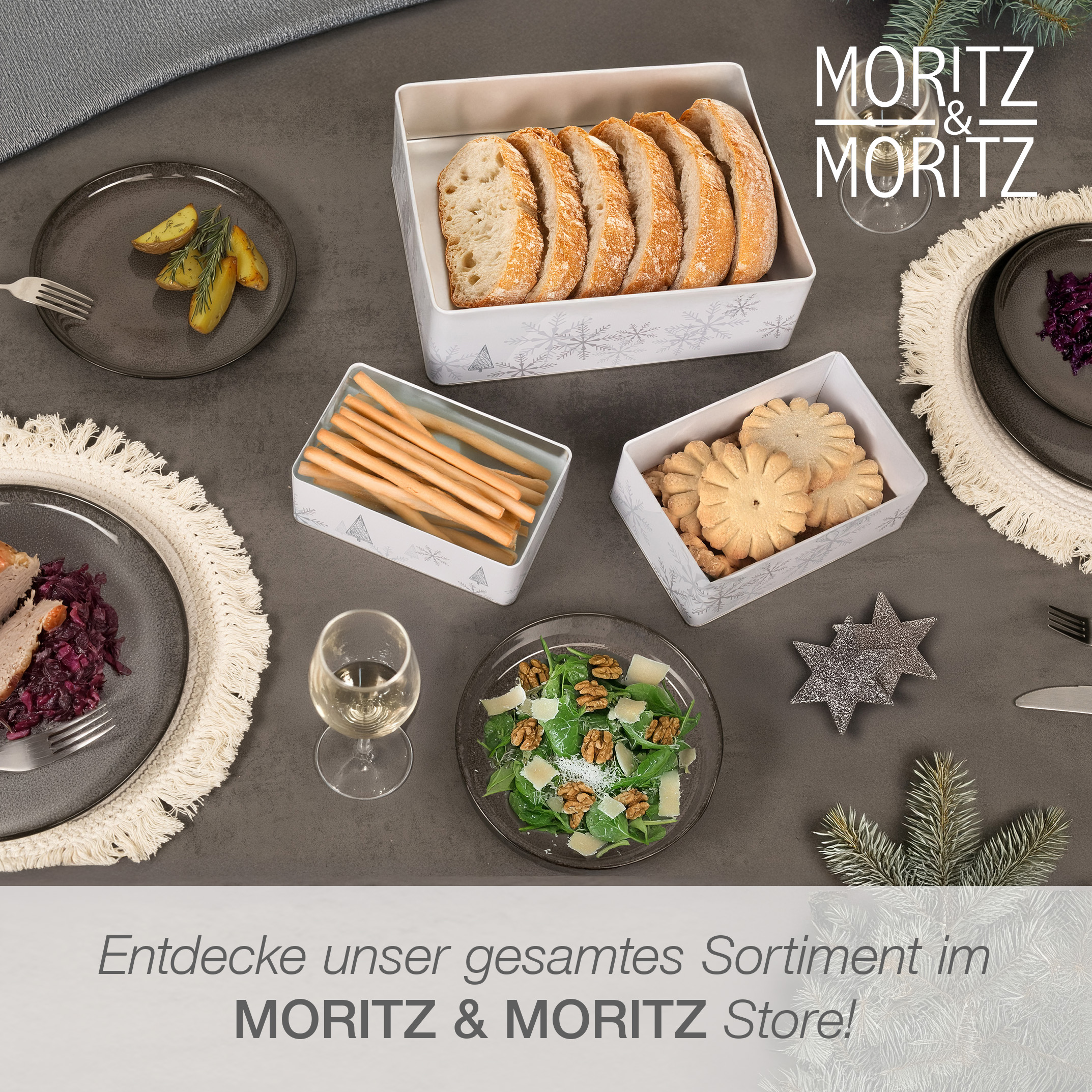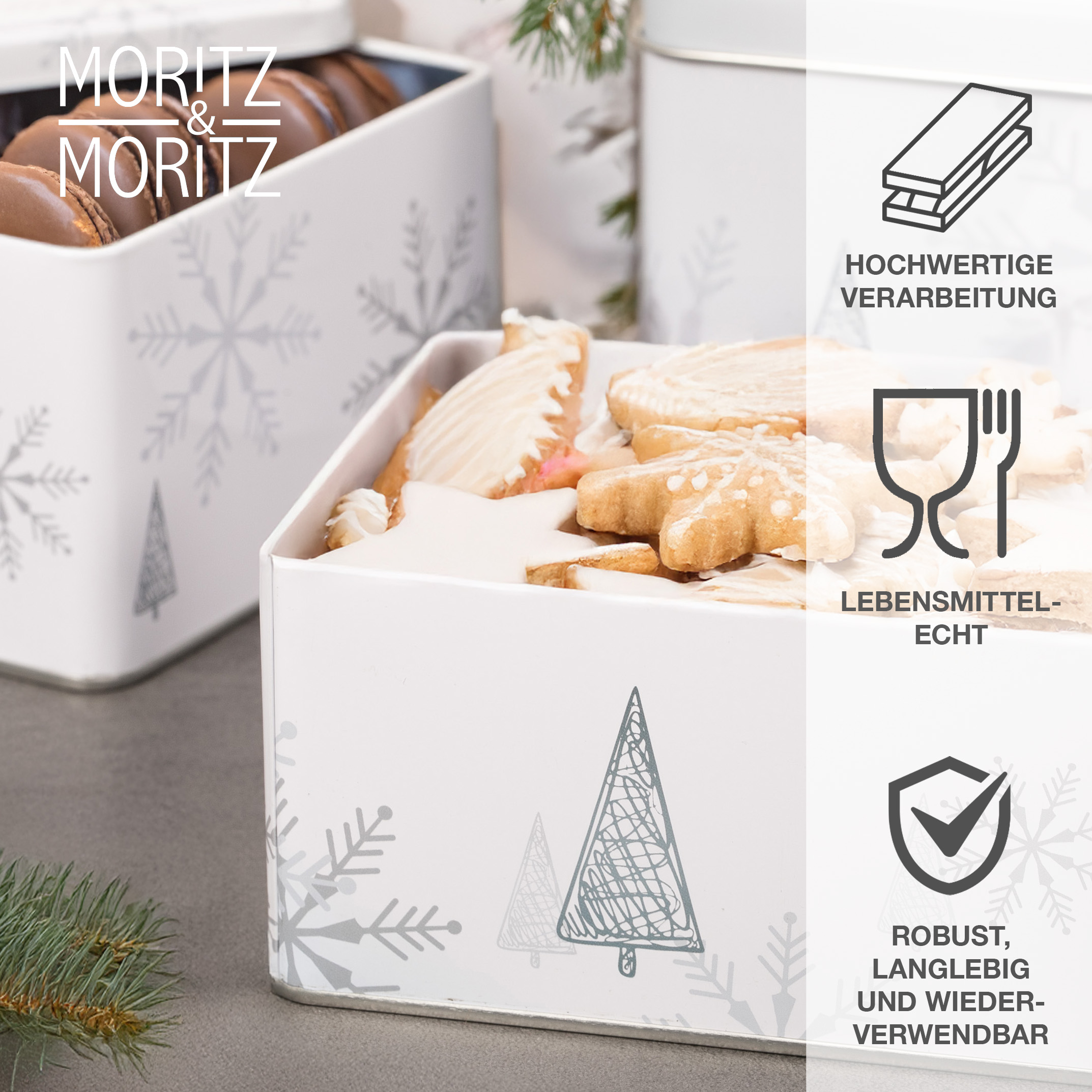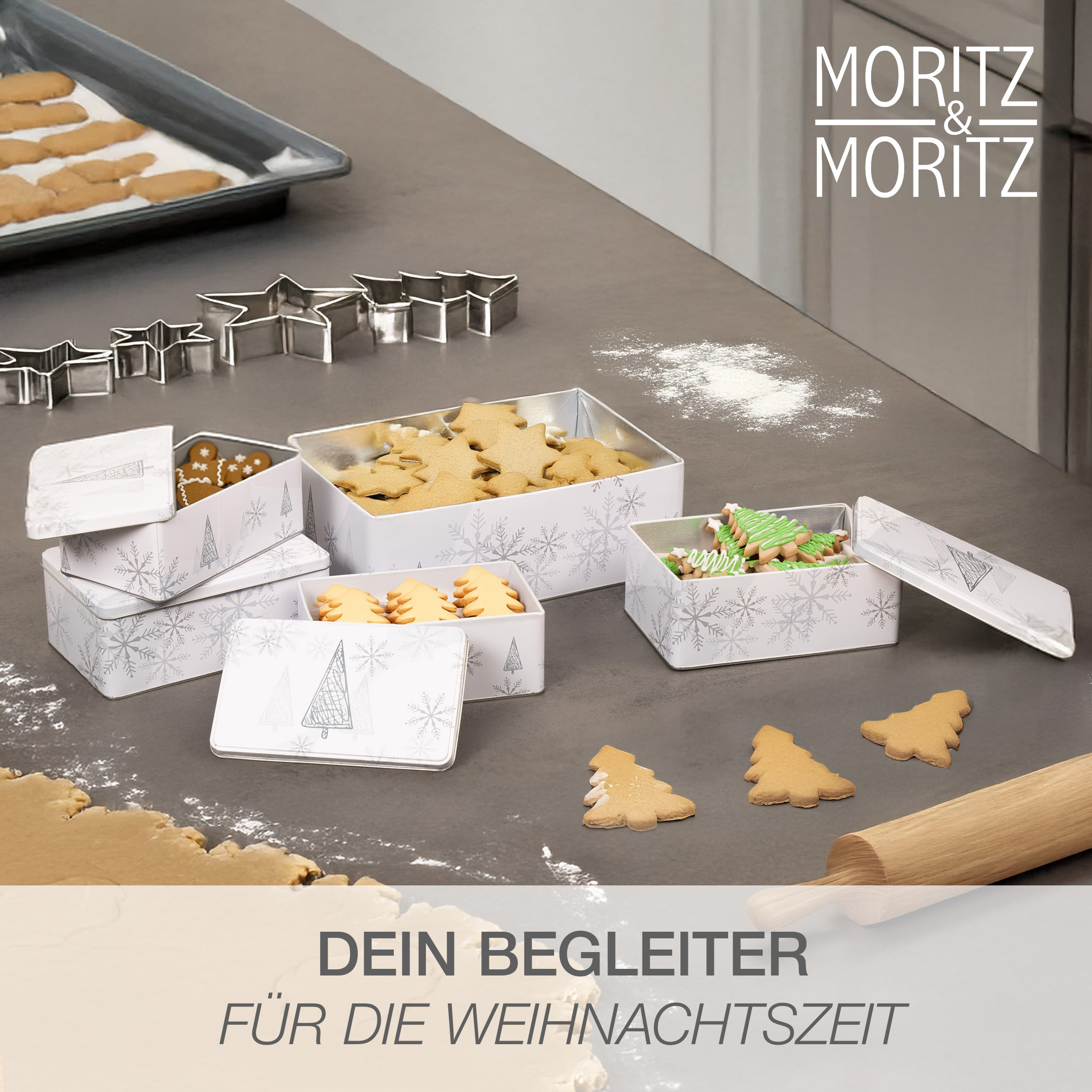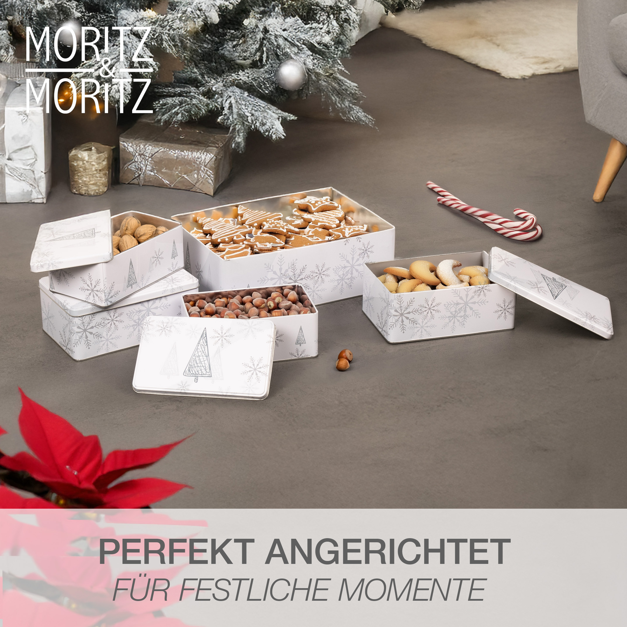 Das Moritz & Moritz Keksdosen Set Weihnachten (5-teilig) bringt festliche Stimmung in deine Küche und sorgt gleichzeitig für Ordnung und Frische. Die eckigen Blechdosen mit Deckel sind perfekt geeignet für Plätzchen, Gebäck, Kekse, Pralinen oder kleine Leckereien und begeistern durch ihr liebevolles Weihnachtsdesign.
