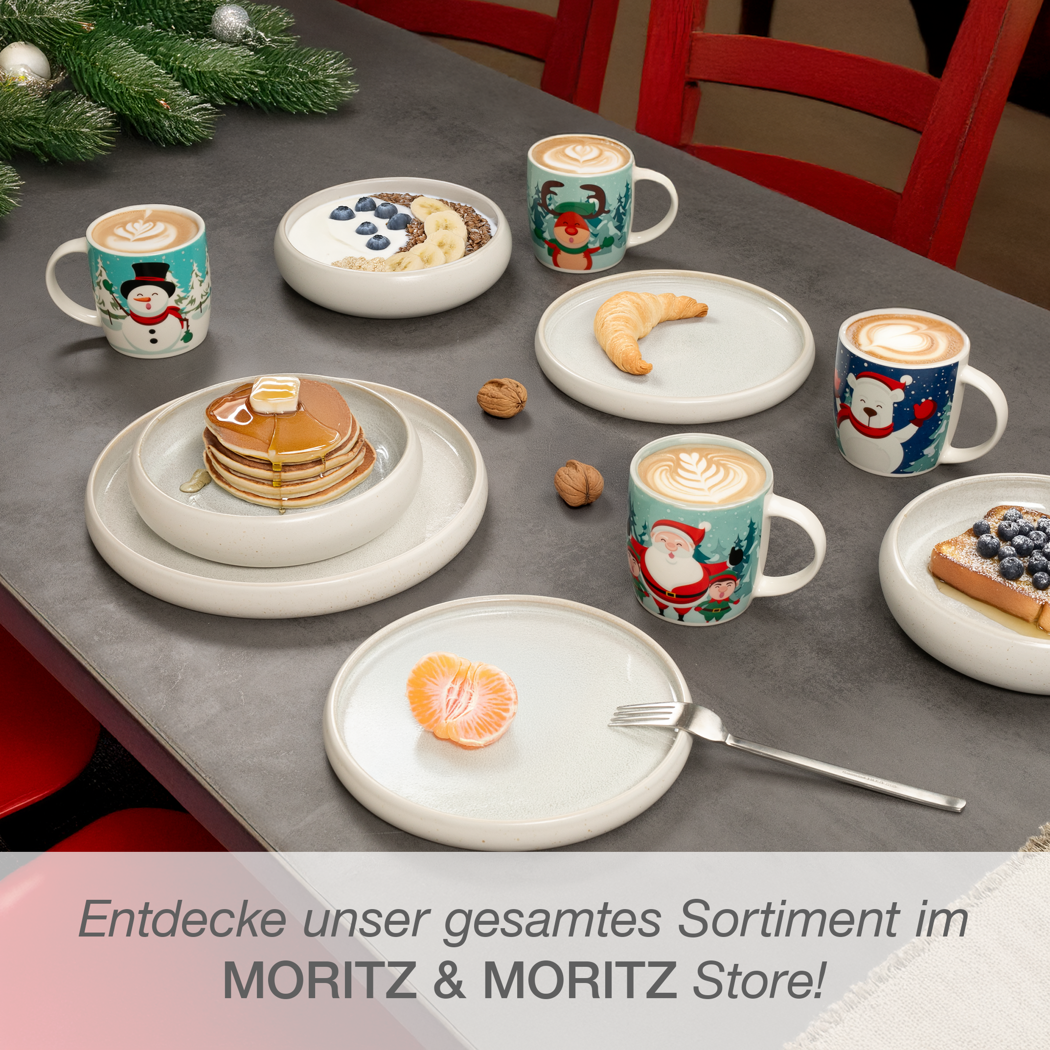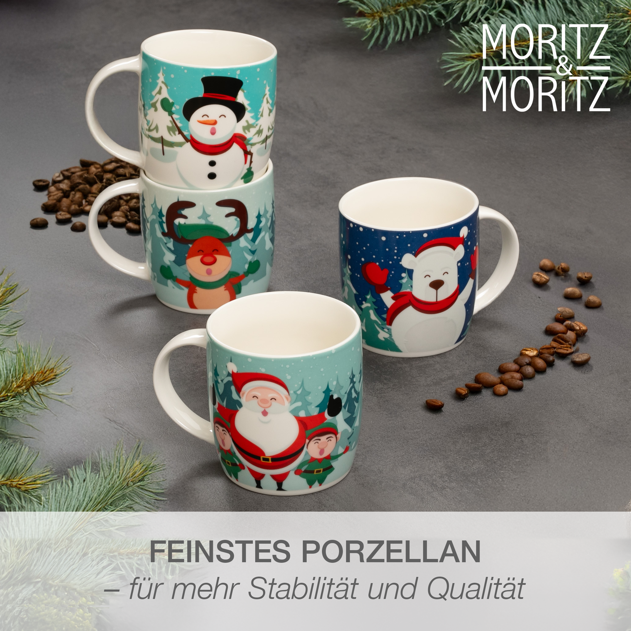 Das Moritz & Moritz Weihnachts-Tassen Set bringt stimmungsvolle Weihnachtsfreude auf den Tisch. Die vier Porzellanbecher mit winterlichen Motiven sind perfekt für gemütliche Stunden mit Kaffee, Tee, Kakao oder Glühwein. Mit einem Fassungsvermögen von 350 ml bieten sie die ideale Größe für deine liebsten Heißgetränke – ob beim Adventsfrühstück, auf der Couch oder beim Plätzchenbacken.